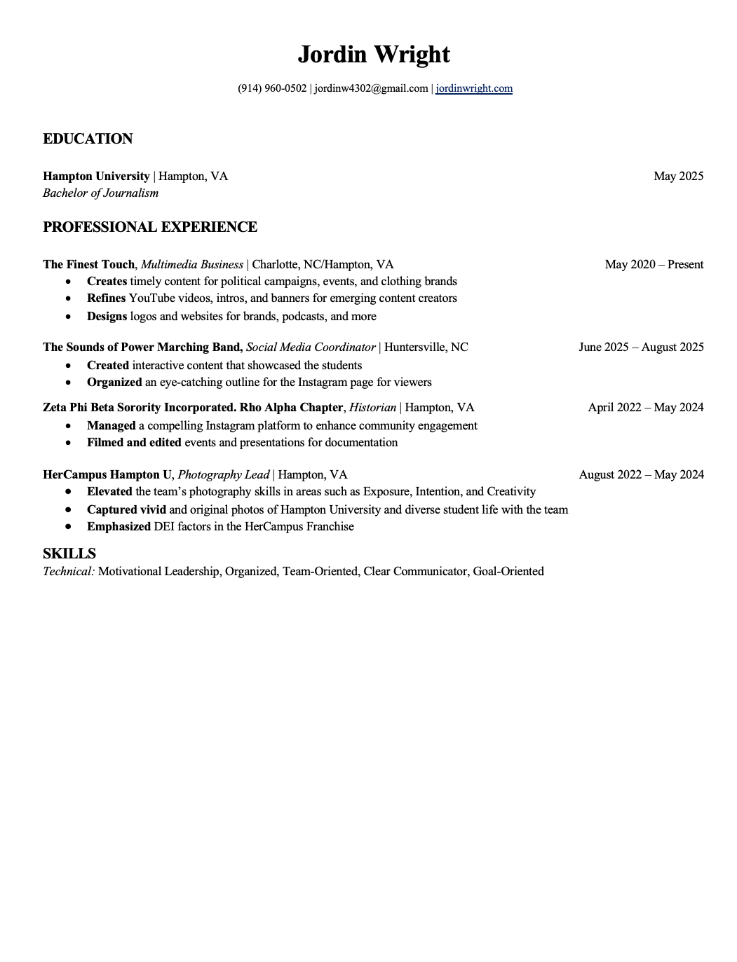 Jordin Wright is a creative multimedia specialist with a with a degree in Journalism from Hampton University. She has experience in video production, camera operation, sound engineering, and digital marketing. Skilled in leading teams, producing award-winning content, and balancing academic and professional excellence with a focus on storytelling and community impact.